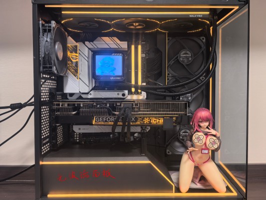 所有图都是手机直出,0后期。海景房发光部分,机箱为追风者NV5+灯条套件,水冷是瓦尔基里V360 Loki,主板ROGX670吹雪,内存阿斯加德女武神,唯一的遗憾是风扇和显卡,我选了光污染少的追风者T30和RTX 4080S,如果去年装机的时候能料到今天,我应该选光效更强的给美穗打光。