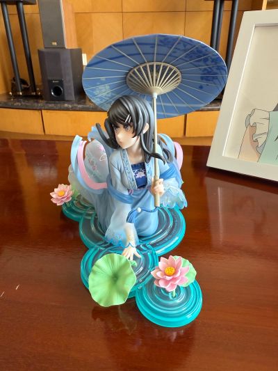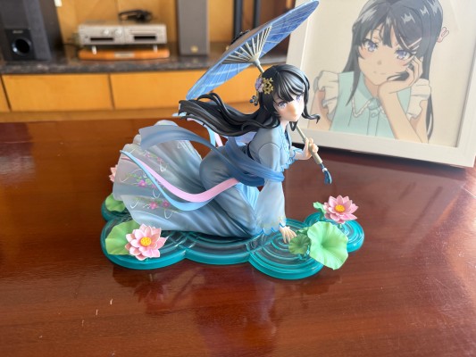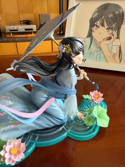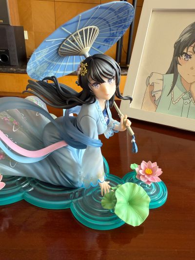 简单开箱一下角川的汉服樱岛麻衣 这款也是我期待了很久的一款手办 作为最喜欢的女主 在三年前这个企划刚出来的时候就被深深地吸引了 但是中间两年一直没有动静以为企划沉底了 但是没想到去年突然就开启预订了 并且今年这么快就直接出货了 不过首先有几句话要不吐不快 角川你还是不是人类了 在刚开始预订的时候 我在所有的平台和店铺都看了一圈 均价都在1500左右 那么作为1/7的比例手办 这个价格已经非常的高了 如果我没有记错的话 最高的一家全款下来是1690 这是什么定价我请问了 谁给角川的这种定价的勇气我请问呢 1/7卖到了1/4的价格 虽然角川基本上后期都是五折起步 不过对于这种偏冷门并且可预见货量不大的手办 她的后期降价的空间应该也不是很大 鉴于之前高追了spiritale的月亮麻衣 所以为了樱岛麻衣 还是决定忍痛下手 不过因为有rh还有sj的存在 所以我没有直接原价预订 最终在rh刷到了这一款 所以就在rh以950的价格拿下 最终的入手价还是比较能接受 但我还是想说在今年整体手办都降价的情况下 角川是谁给你勇气拿出这种定价的 作为这种明显官方就有直接溢价的手办 不推荐任何人预定 要么就是等等现货或者其他的平台 抱怨完毕以后 就来说说优缺点 先说缺点 因为考虑到他的定价 她的缺点实在是太过于多 同时让人非常难以接受 首先就是这个脸 开箱的一瞬间就让人感到怪异 你谁啊我请问呢 不仅仅是角度限定的问题 甚至脸型崩得都有点不像了 在这种价位出现这种问题是绝对绝对不应该的 并且这个脸型配上这个抬头的角度 不论从哪个方向看都没有官图的那种亲和感 整体左右偏胖 有点婴儿肥的感觉 其次就是这个大小 整体也太小了一点 还是跟spiritale的月亮麻衣做个对比 这个体积差距是一目了然的 同样是一个场景配一个人物主体 麻衣主体大小对比下来差不多大 但是这个场景也太过于寒酸了 底座的荷叶(或者是涟漪) 不仅特别薄 而且看起来就是一眼的没有质感 整个场景显得非常小气 麻衣的裙边都紧紧贴着周围的花 一点多余的空间都没有 最后再说说优点 作为这个价位的手办 涂装自然是没得说的 汉服从上到下 还有从肩膀到袖口都是从实色慢慢渐变过渡到透明 相比较百元价位的景品手办 整体的过渡非常的自然 一眼看得出来做工非常精良 其次是整体细节的涂装 比如头发以及头发上面的装饰品 没有一点点的出界蹭色 边界清晰可见 整体的喷涂还是对得起价位的 其次就是作为配件之一的雨伞 雨伞的支撑杆是金属的 拿在手里非常的扎实 伞面的做工也非常的锐利 一看就很清爽养眼 单看人物主体的造型和涂装可以打满分 同时腰间的飘带也十分的自然 可以表现出来动态的美感 综上所述就是对于这款手办的评价 按照目前xy的价位来说1300左右那肯定是不推荐的 总之各位细节直接看图