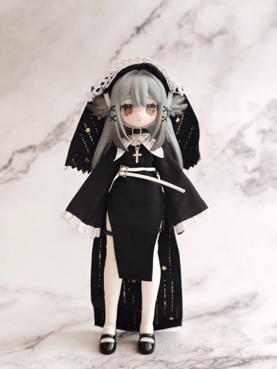 今年年初突然在各大胶佬群里传开的国产MJD盲盒,当时看造型不错,价格也便宜直接选了咩绮家的造物之心系列的这款预定了。 到手之后发现这玩意素质比较一般,作为一款青年向的玩具,做工只能说符合定价了。素体容易被自带的衣服染色,不过头雕还是很细致的,头发有阴影涂装。衣服当然是要玩家自己穿的,对直男很不友好。可动也比较一般,关节感觉也很脆,大腿处的桩位很短容易脱落。衣物边缘缝线太粗,但是夜星这款头巾和长袍内衬的图案挺好看的。袜子的紧身效果也很差,袜口没有尼龙环固定摆造型容易卡进膝盖缝隙,但是皮鞋做工不错。这款的站姿稳定性也不太行也没有支架,我拍的基本都是坐姿和跪姿。 总的来说,作为一款百元以下的盲盒产品,创意造型这一块确实给你拉满了,但是还是希望厂家以后能提高素体和衣服的品质,毕竟这玩意也没啥IP作品加持,在现有价格上改进做工我认为还是未来可期的。