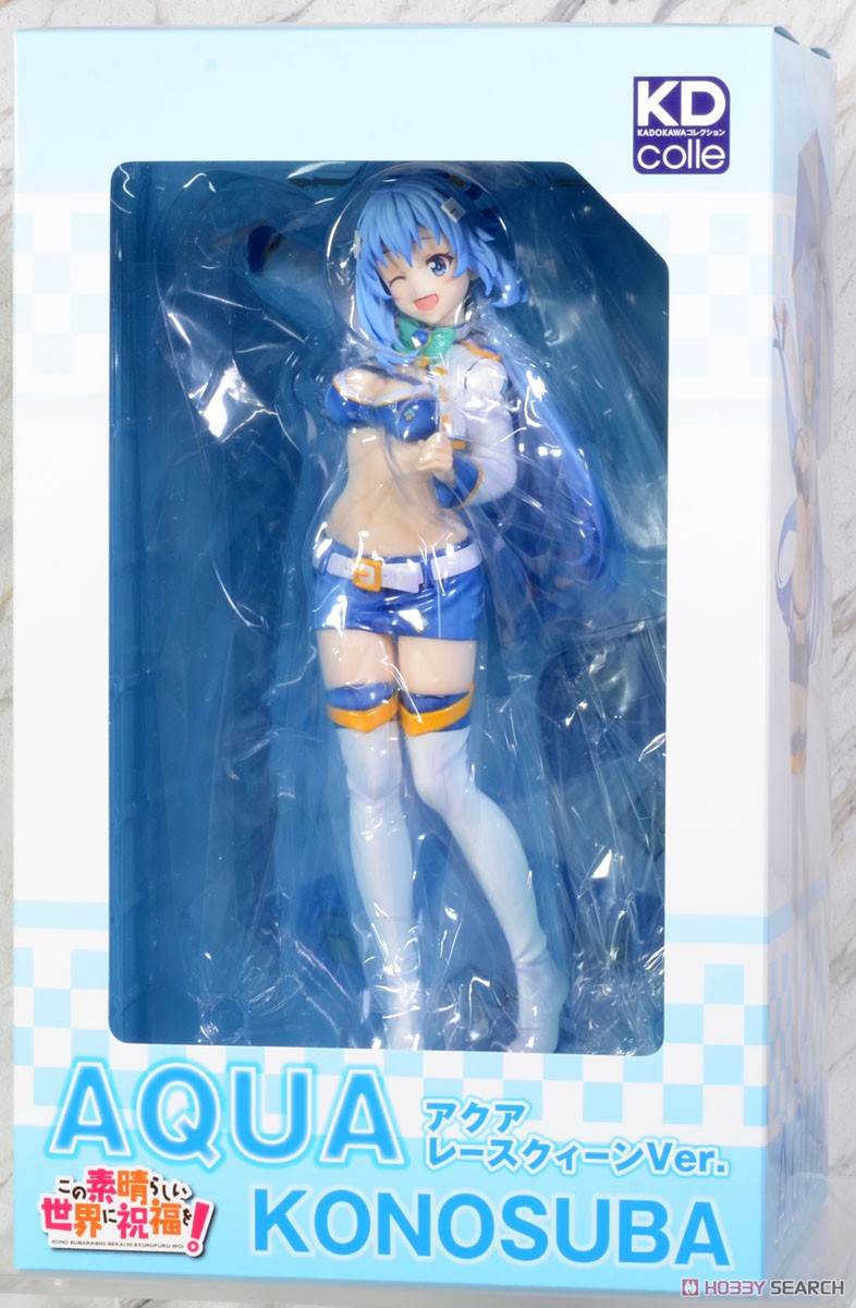 出自動畫《為美好的世界獻上祝福!》,水之女神阿克婭穿著賽車女郎的服裝化身為比例模型!以藍色與白色為基礎色調的服裝,採用光澤塗裝表現琺瑯的材質感。大大的陽傘上有阿克西斯教的圖案標誌。美麗飄逸的頭髮、活力十足的動作,以及可愛眨眼的表情等等,充滿了阿克婭的魅力!被如此魅力的女神支持的話,一定會大獲全勝!?將這樣的阿克婭大人帶回家鑑賞吧。
