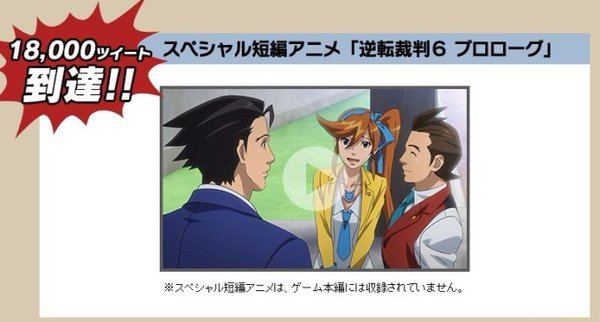 カプコンは、3DS用ソフト『逆転裁判6』の応援ツイートキャンペーン達成を受け、スペシャル短編アニメ『逆転裁判6 プロローグ』を公開しました。公式サイトの映像コーナーで視聴できます。